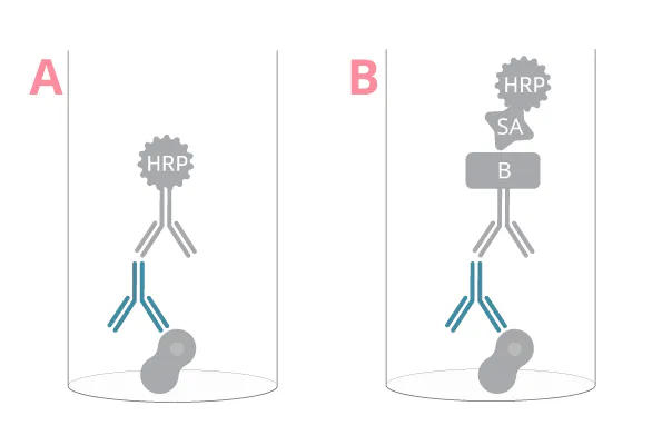 •   使用對結(jié)合的免疫球蛋白的 Fc 部分具有特異性的抗體來檢測剩余的抗原特異性免疫球蛋白。這通常以同種型特異性方式進行,例如僅 IgG 檢測。從更實際的角度來看,可以使用一步(圖 2A)或兩步檢測設(shè)置(圖 2B)。由于抗原特異性免疫球蛋白的豐度可能較低,因此更靈敏的兩步檢測可能更適合放大檢測信號。