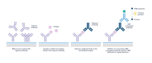 ELISA實(shí)驗(yàn)檢測可溶性物質(zhì),如肽、蛋白質(zhì)、抗體和激素。它們通常以“夾心”形式進(jìn)行(圖)。夾心ELISA通過使用結(jié)合到ELISA板上的捕獲抗體來固定目標(biāo)蛋白質(zhì),同時(shí)檢測抗體產(chǎn)生讀出信號(hào)來識(shí)別分析物。與間接形式相比,使用抗體對(duì)可顯著提高夾心ELISA的特異性和靈敏度,而抗體驗(yàn)證是確保準(zhǔn)確和可重復(fù)結(jié)果的關(guān)鍵步驟。